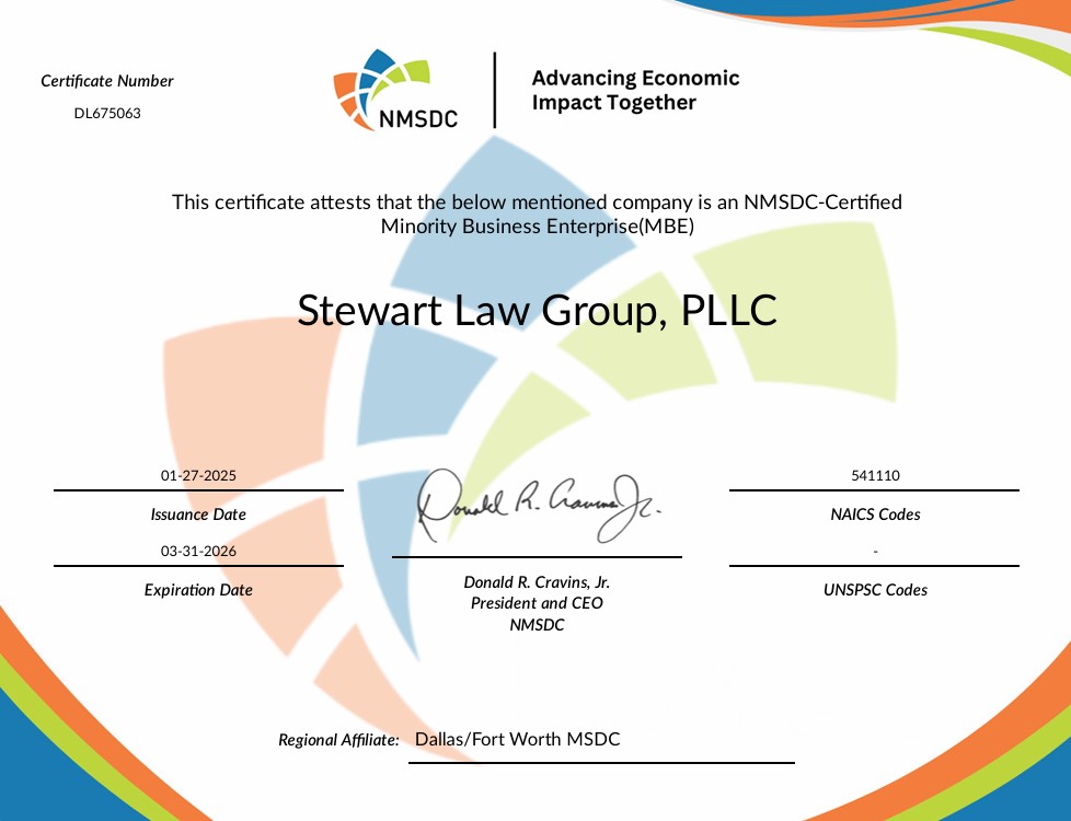 NAMWOLF – The National Association of Minority & Women Owned Law Firms Member Certificate